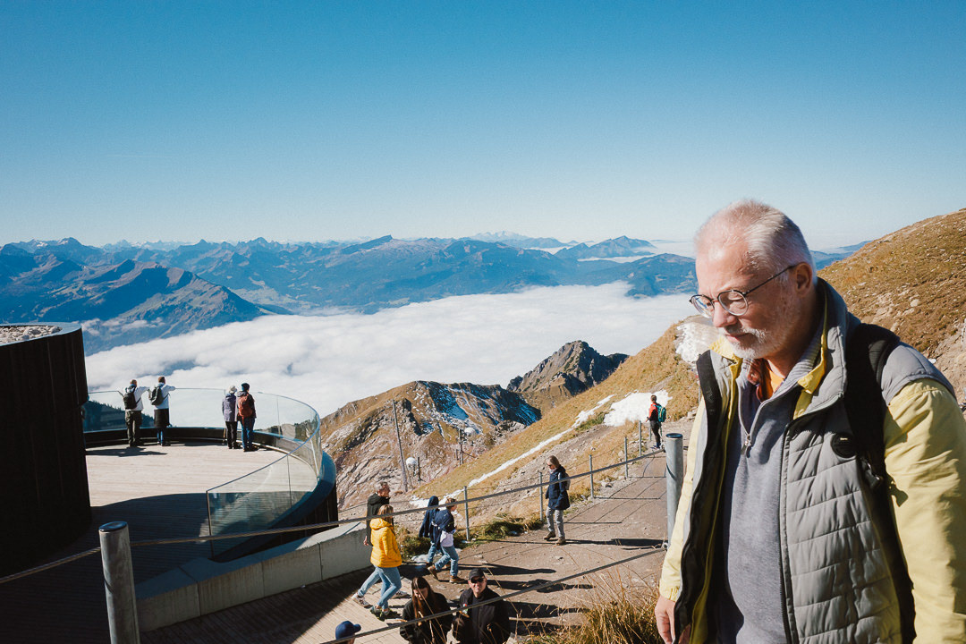 Ein älterer Herr genießt den Moment am Gipfel – über den Wolken, friedlich.