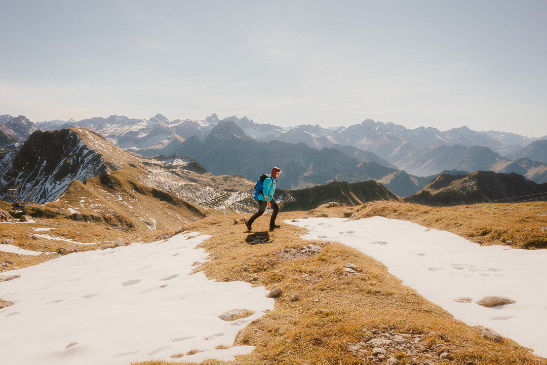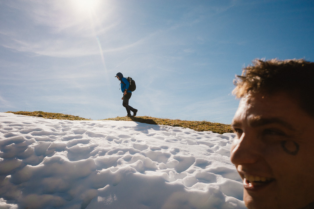 Matthias geht über letzte Schneefelder, die Berge leuchten in der Ferne.