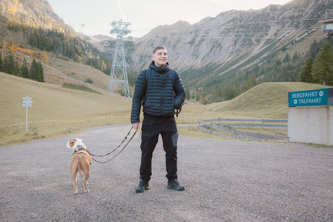 Vince mit seinem Hund – bereit für den Aufstieg, die Luft ist kühl und klar.